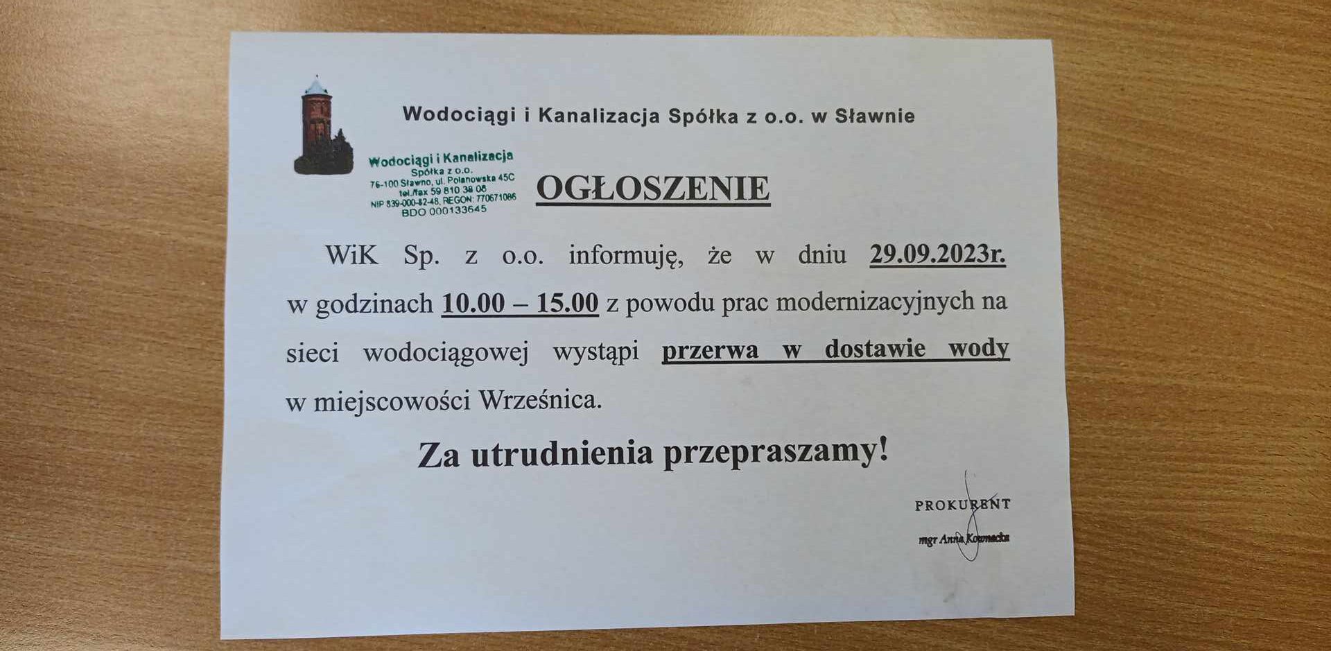 W związku z przerwą w dostawie wody w dniu jutrzejszym tzn. 29.09.2023 r.- przedszkole będzie ZAMKNIĘTE!